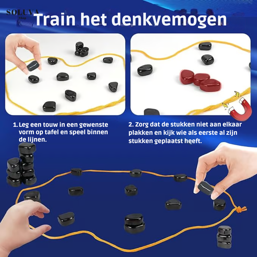 Het opvouwbare bord past in één handomdraai in de meegeleverde doos. Neem het spel mee naar vrienden, op vakantie, of naar het buurthuis en start binnen enkele seconden. De zachte magnetische stenen voelen prettig aan en liggen comfortabel in de hand.